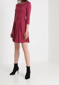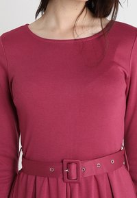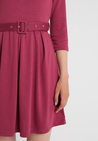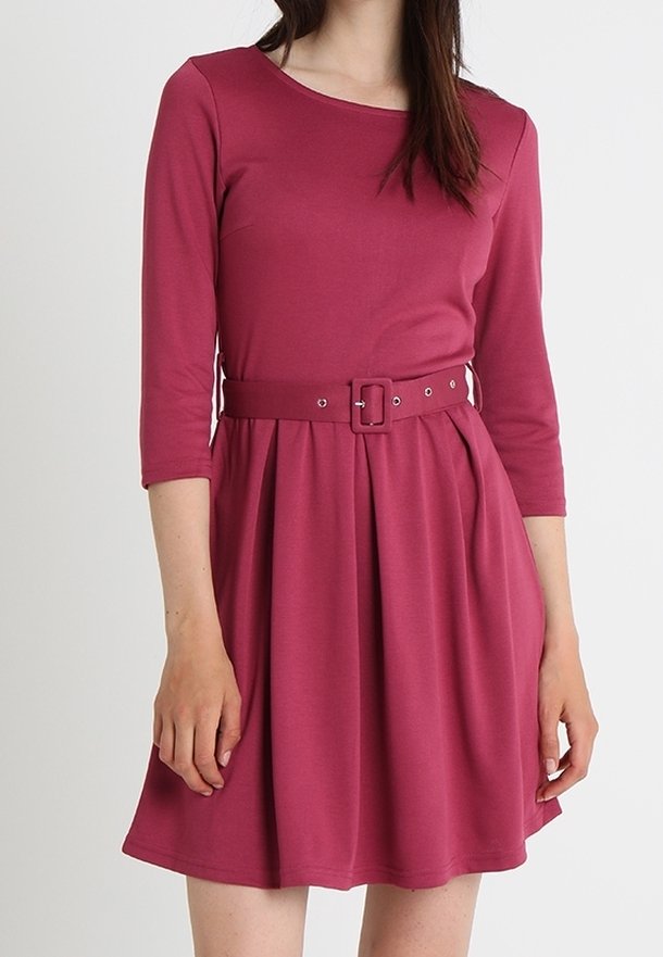 Femme portant une robe berry de longueur genou avec des manches trois-quarts et une ceinture assortie avec une boucle carrée.