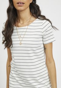 Femme portant une robe blanche à manches courtes avec des rayures horizontales noires et des bottes plates noires épaisses mi-mollet, posant avec une main sur la hanche.