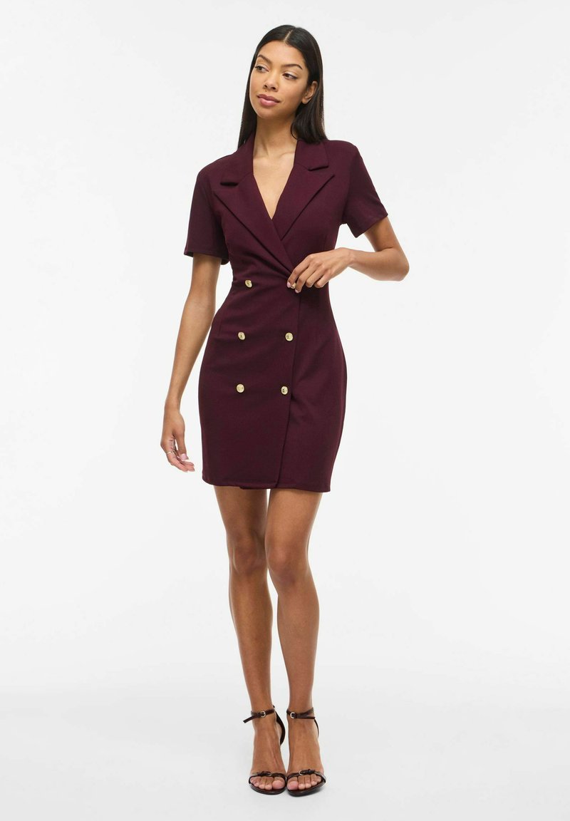 Femme debout portant une robe bordeaux à manches courtes, croisée avec des boutons dorés et des talons noirs à bride cheville sur un fond blanc.