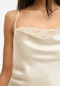 Femme aux longs cheveux noirs portant une robe nuisette en satin crème à fines bretelles et bordure en dentelle, associée à des talons pointus ornés.