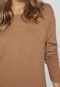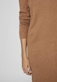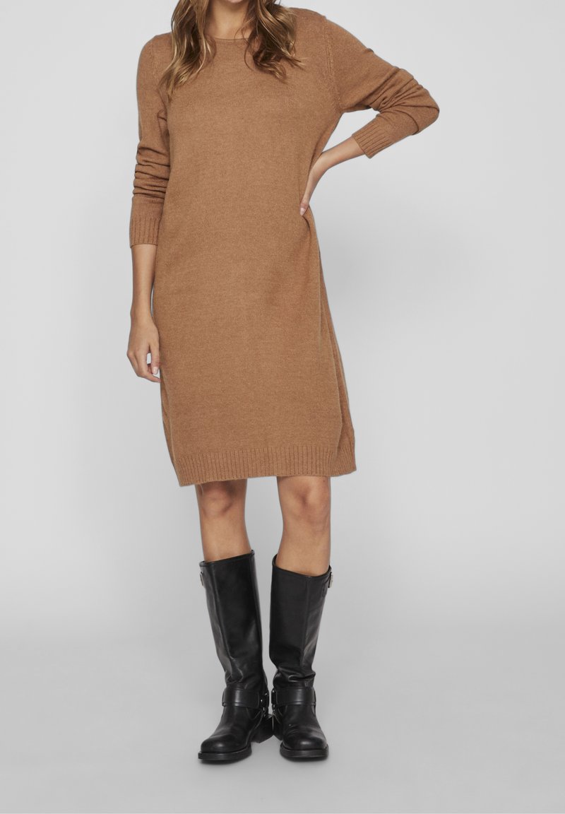 Femme portant une robe-pull camel marron longueur genou à manches longues et des bottes en cuir noires montant jusqu'aux genoux, debout avec une main sur la hanche.