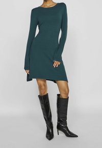 Femme portant une robe ajustée à manches longues couleur sarcelle et des bottes noires montantes, debout devant un fond uni.
