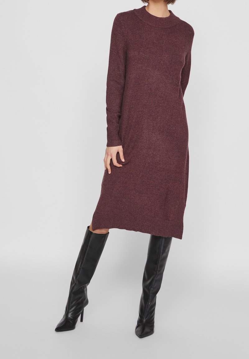 Robe en maille bordeaux à manches longues et col arrondi, présentant une coupe droite et un ourlet côtelé. Portée avec des bottes noires montant jusqu'aux genoux.