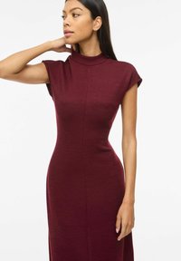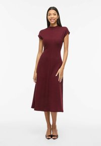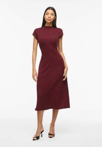 Femme portant une robe midi bordeaux ajustée sans manches avec un col montant et des sandales à talons ouvertes noires, debout sur un fond blanc.