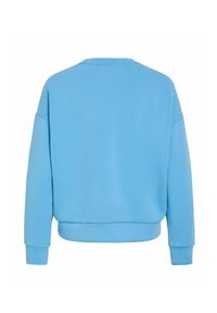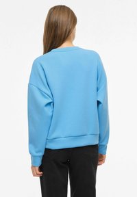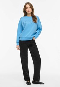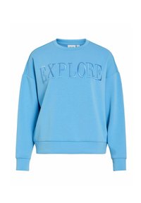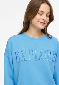 Femme portant un sweat-shirt bleu clair avec le texte "EXPLORE" sur la poitrine et un pantalon noir, debout devant un fond blanc uni.
