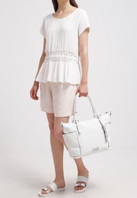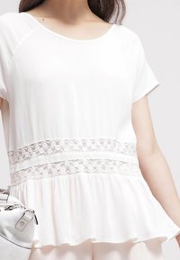Femme portant un haut blanc à manches courtes avec bordure en dentelle et ourlet à basque, assorti à un short clair longueur genou.