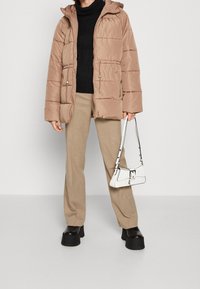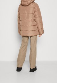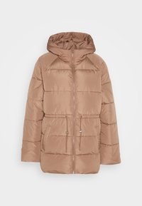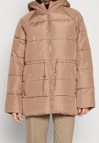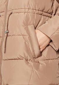 Femme portant une veste d'hiver matelassée beige avec une fermeture éclair à l'avant, une capuche, des cordons de serrage ajustables à la taille et des poches latérales.