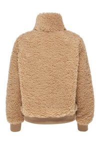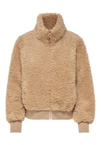 Veste en polaire beige courte avec fermeture éclair sur le devant, col haut, poignets et ourlet côtelés, présentant une texture douce et bouclée.