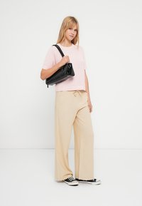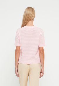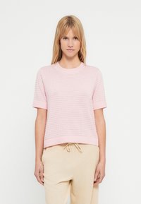 Pull rose clair en tricot avec un motif texturé, col rond et manches courtes, associé à un pantalon beige à taille élastique.