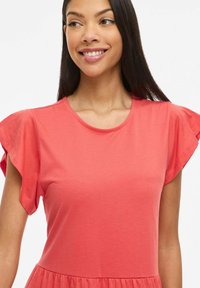Robe corail longueur genoux avec manches courtes à volants, taille froncée et jupe à volants. Matière en coton lisse avec une coupe décontractée.