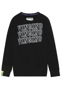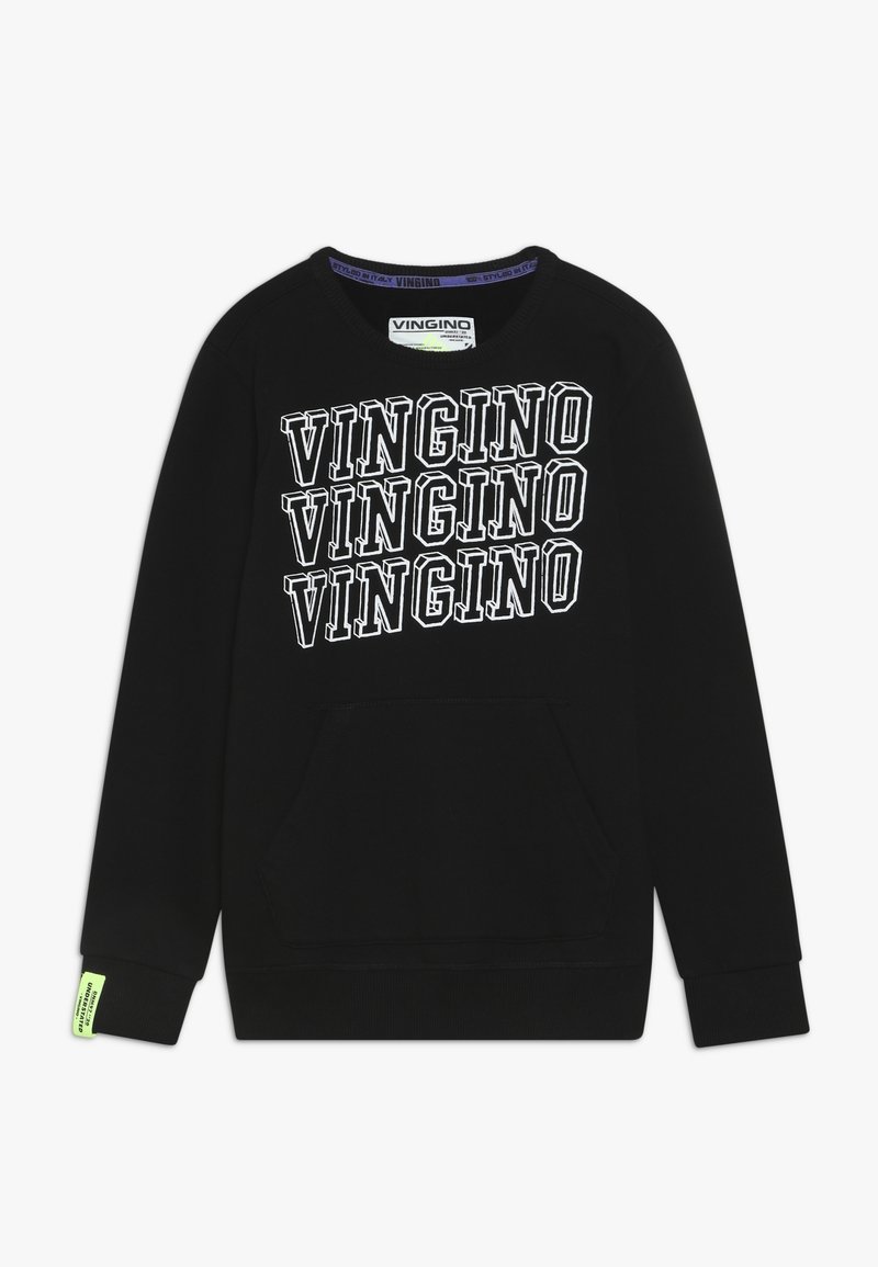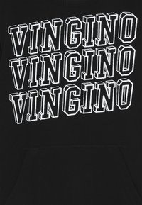 Sweat-shirt noir avec trois textes "VINGINO" empilés en contour blanc sur la poitrine et une poche kangourou à l'avant.