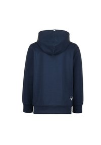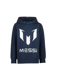 Hoodie bleu marine en tissu doux, doté d'un emblème blanc et du texte "MESSi" sur le devant, avec une poche kangourou et une capuche à cordon.