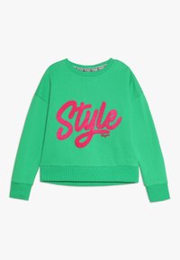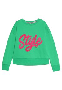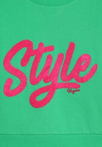 Sweatshirt vert avec col rond, manches longues retroussées et design cropped. Présente un grand texte rose en peluche écrivant "Style" sur le devant.