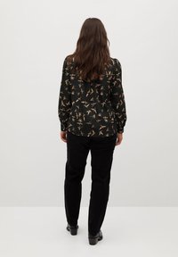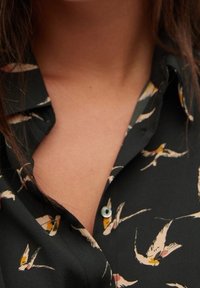 Chemisier noir avec un motif d'oiseaux multicolores, design boutonné et épaules froncées, porté avec un jean foncé. Texture lisse.