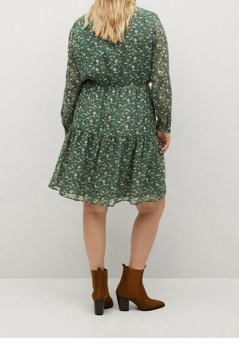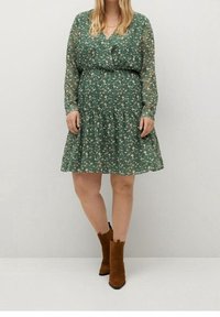 Robe florale verte avec une jupe à volants, des manches longues transparentes et une taille cintrée. Portée avec des bottines marron à talon large.