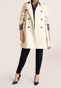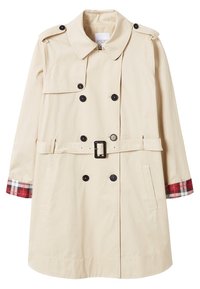Trench-coat beige à double boutonnage, boutons noirs et doublure à carreaux sur les manches. Dispose d'un col classique et d'une coupe ample.