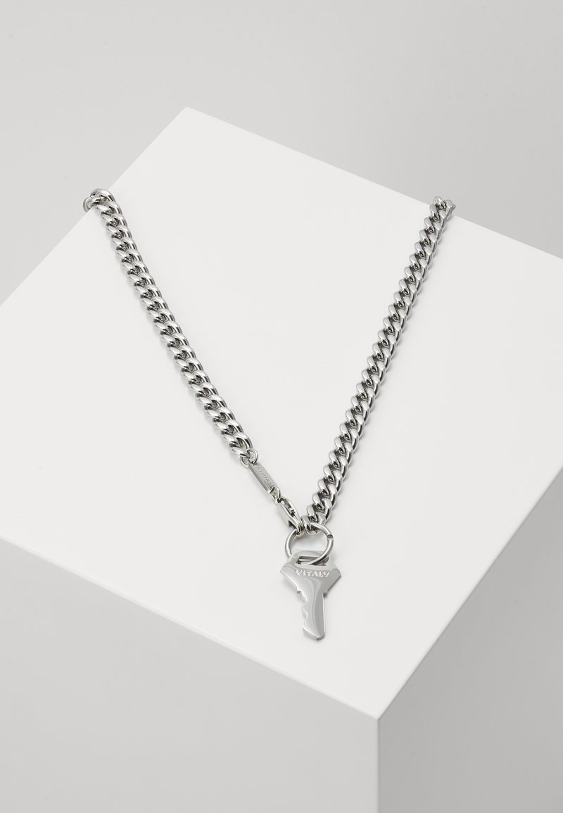 Collier chaîne en argent avec des maillons épais et un pendentif en forme de clé gravé de "VITALY" présenté sur une surface blanche en angle.