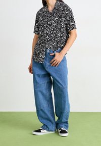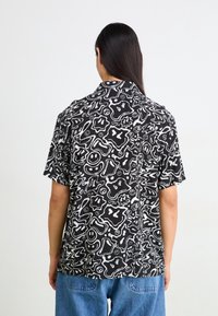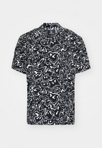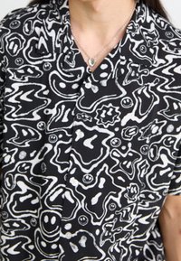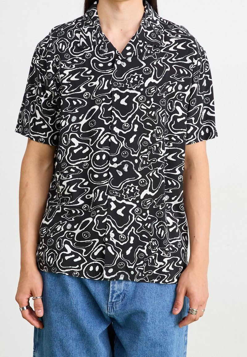 Homme portant une chemise noire à manches courtes avec un motif abstrait blanc et un visage souriant, associée à un jean bleu et des bagues argentées aux doigts.
