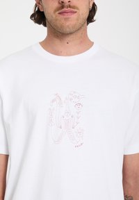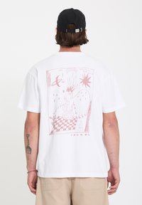 Jeune femme de face et homme de dos portant des t-shirts blancs avec des motifs graphiques rouges abstraits et des pantalons décontractés devant un fond uni.