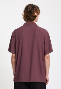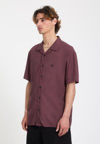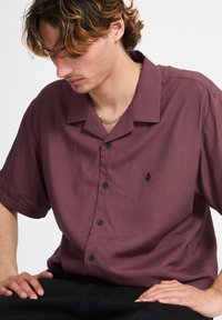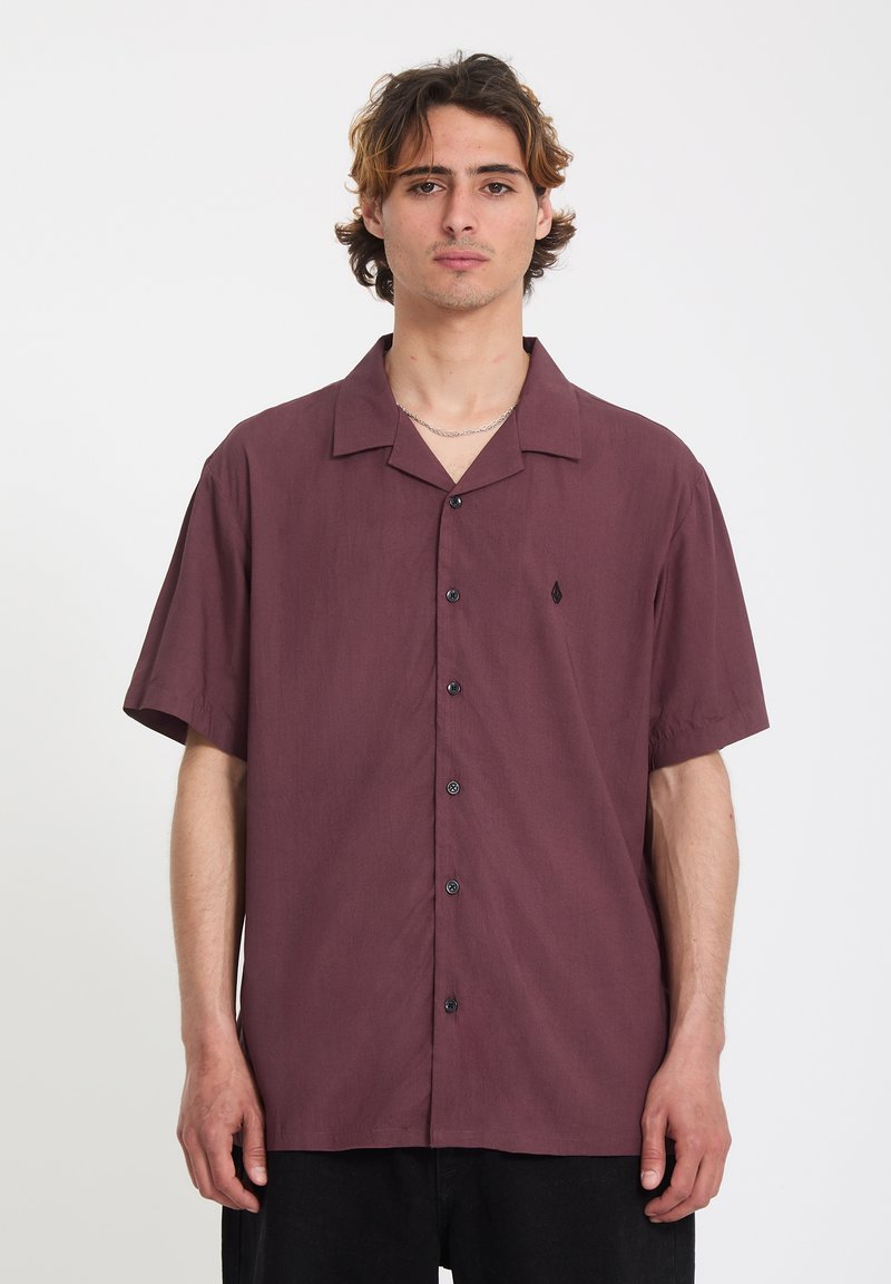 Jeune homme aux cheveux mi-longs portant une chemise bordeaux à manches courtes et à boutons, devant un fond uni.