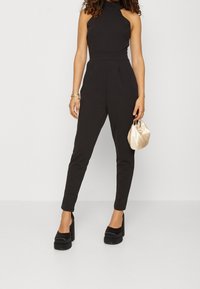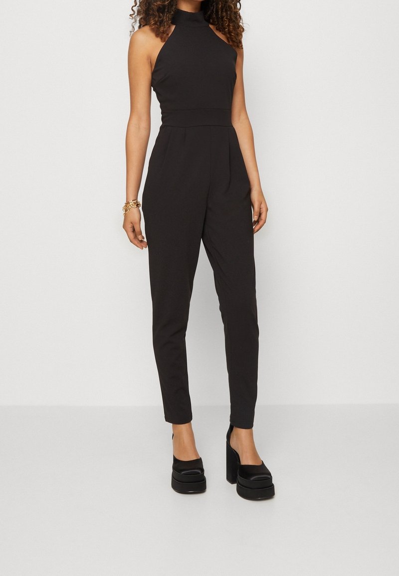 Une combinaison noire avec un col montant et sans manches, un buste ajusté, des jambes fuselées et un tissu texturé. Assortie à des chaussures à plateforme noires chunky.