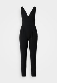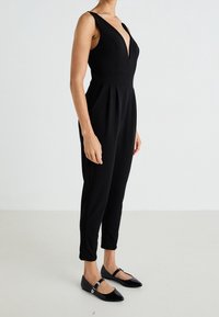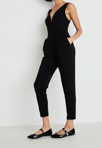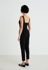 Combinaison noire avec un corsage ajusté, des bretelles larges et des jambes fuselées. Dotée d'un dos carré et d'une fermeture éclair. Portée avec des ballerines noires.
