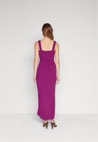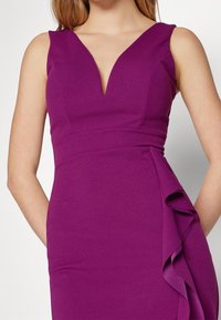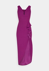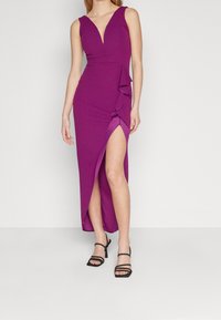 Robe sans manches violette avec un décolleté en V profond, présentant des volants sur les côtés et une fente haute sur la cuisse. Le matériau semble lisse et ajusté.