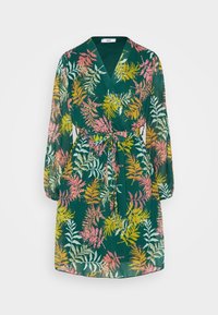 Robe portefeuille florale verte avec des motifs de feuilles roses et jaunes, dotée de longues manches, d'un lien à la taille et d'un décolleté en V. Portée avec des talons noirs.