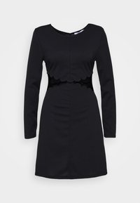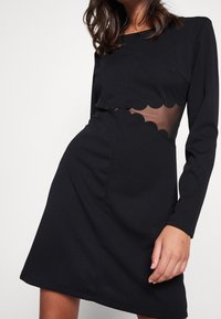 Robe noire à manches longues avec un détail découpé transparent et festonné à la taille. Associée à des talons compensés rose vif.