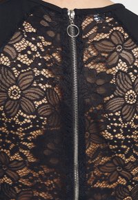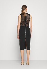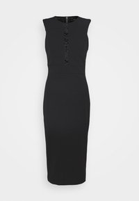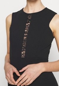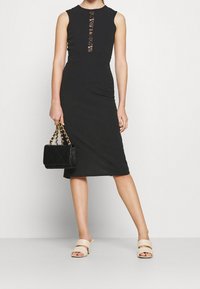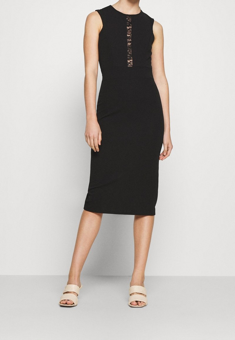Femme portant une robe midi noire sans manches avec un détail en dentelle verticale sur la poitrine, associée à des sandales beiges ouvertes à enfiler.