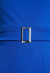 Robe ajustée bleu royal avec un encolure carrée, taille ceinturée et design à hauteur du genou. Matériau mat avec une texture lisse et un minimum de détails.