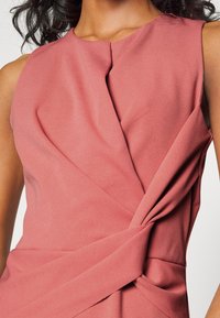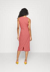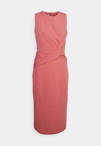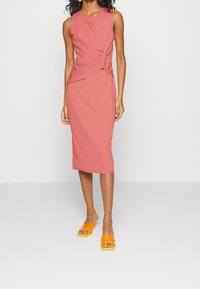 Robe midi rose fuchsia avec un design sans manches, un détail torsadé à l'avant et une texture lisse. Associée à des sandales ouvertes jaunes.