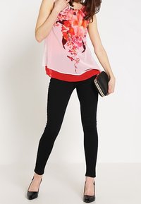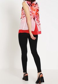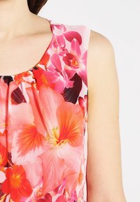 Débardeur sans manches avec un motif floral rose, présentant de grandes fleurs rouges et roses sur un fond blanc ; superposé sur un ourlet rouge, en tissu doux.