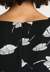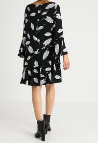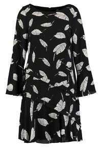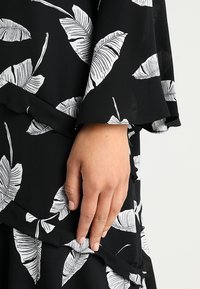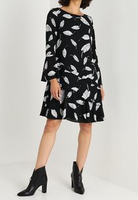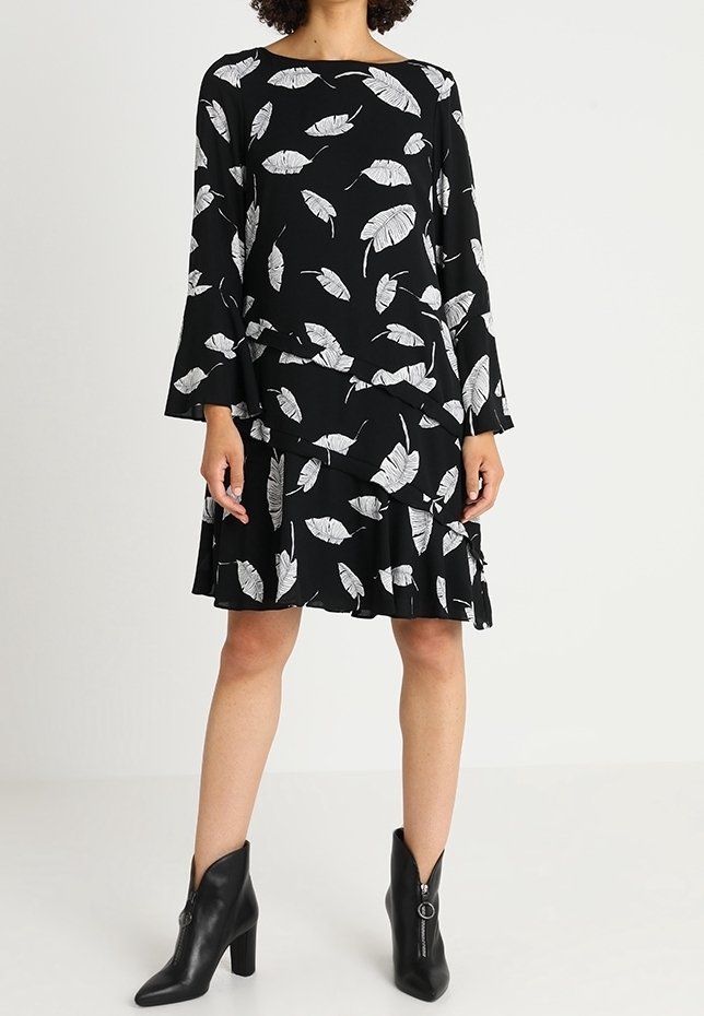 Femme portant une robe noire avec des motifs de feuilles blanches et des manches longues, associée à des bottines noires à talons.