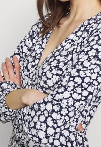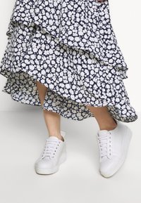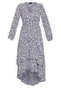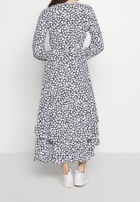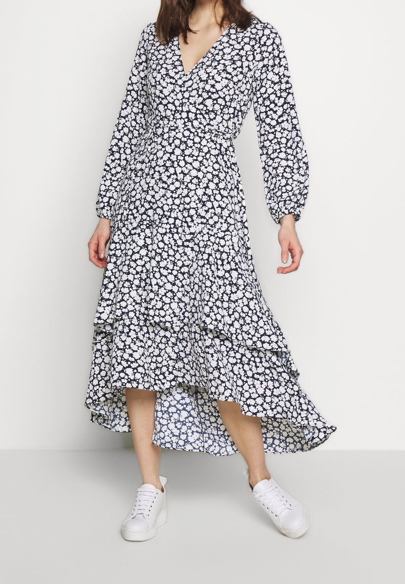 Robe à manches longues, à motif floral bleu et blanc, avec un col en V, un ourlet volanté et une conception à niveaux, associée à des baskets blanches.
