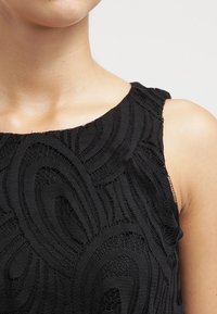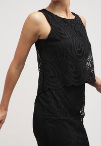 Robe noire à design superposé, avec des bords festonnés et un tissu texturé. Sans manches, silhouette mi-longue jusqu'aux genoux. Portée avec des talons noirs.