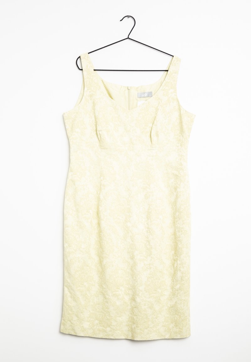 Robe sans manches en satin de couleur jaune pâle avec motif floral. Coupe cintrée avec un décolleté en V et une fermeture éclair dissimulée au dos.