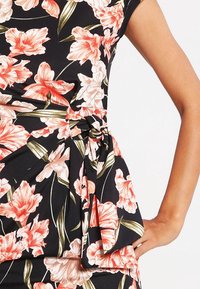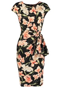 Robe ajustée à motif floral avec des manches courtes, fond noir, fleurs roses et oranges, détail de taille cintrée, associée à des talons métalliques à lanières.