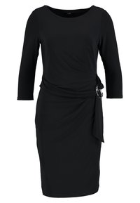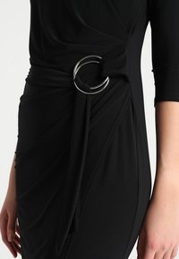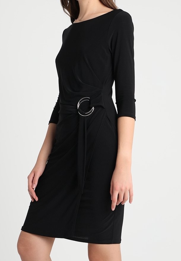 Robe noire à manches trois-quarts, décolleté rond, détail froncé à la taille et accent circulaire argenté. Tissu lisse et ajusté.