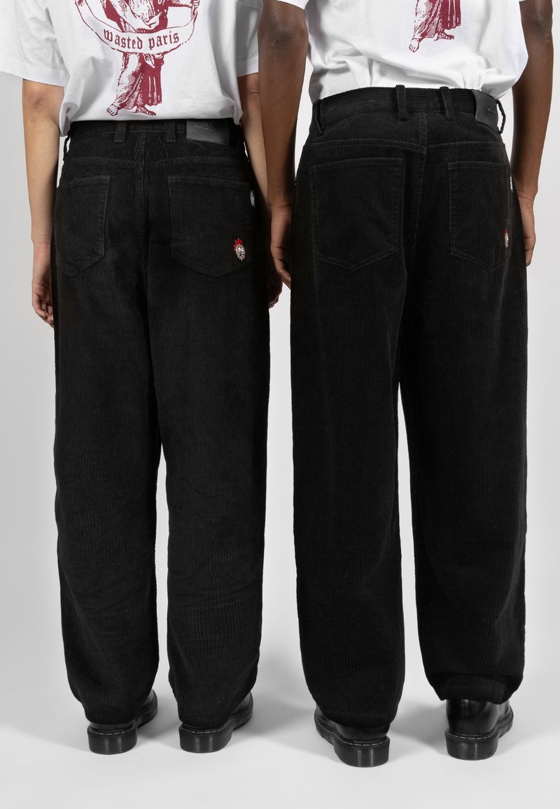 Deux personnes portant des pantalons en velours côtelé noir et des T-shirts blancs avec des motifs graphiques, vues de dos, debout côte à côte devant un fond uni.