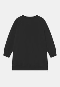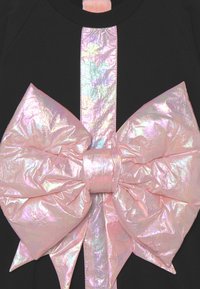 Sweatshirt noir avec un grand nœud rose irisé et des détails de ruban à l'avant. Texture douce avec des manches longues et un design col rond.