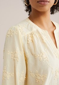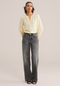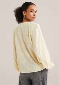 Femme aux cheveux bouclés portant des boucles d'oreilles créoles, un chemisier brodé à fleurs jaune pâle et un jean noir taille haute, les mains dans les poches.