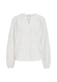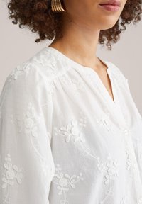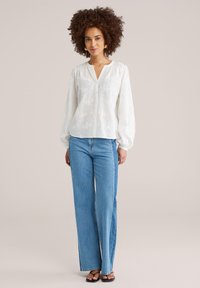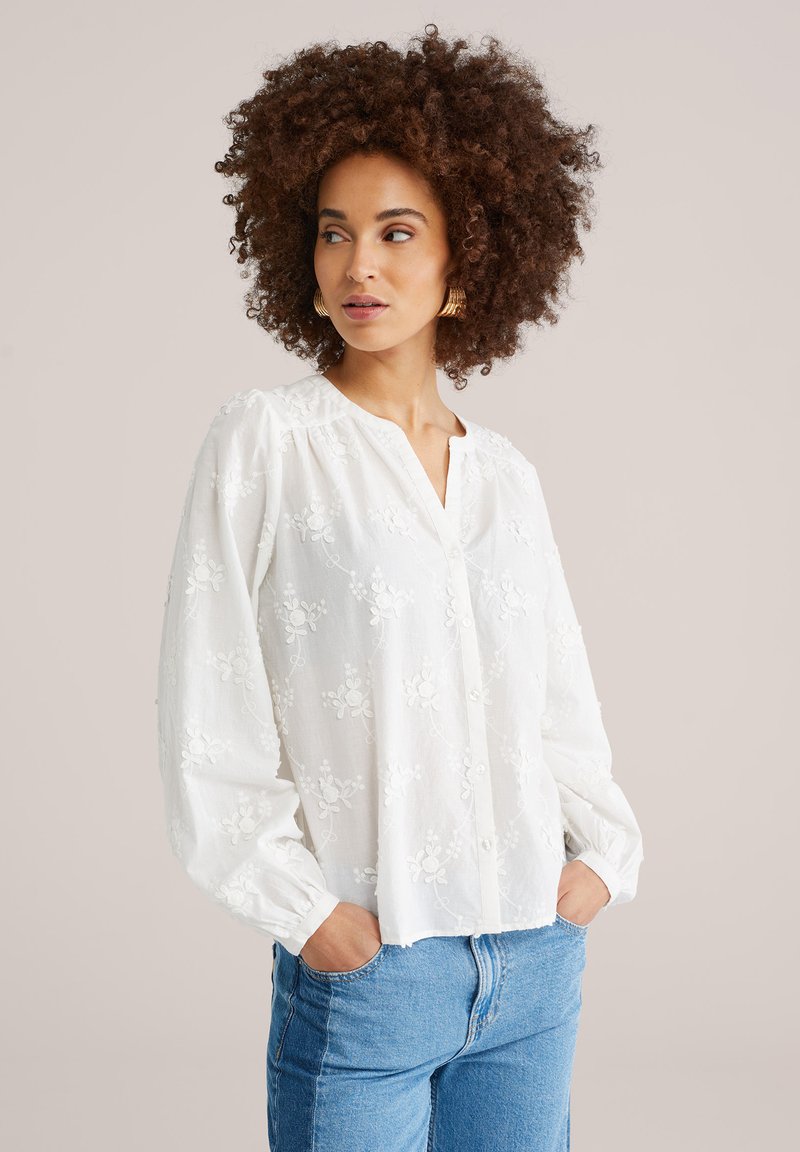 Femme aux cheveux bouclés portant des boucles d'oreilles créoles dorées, un chemisier blanc à manches longues brodé de fleurs, et un jean bleu, les mains dans les poches.