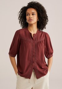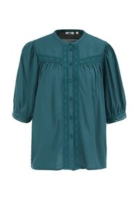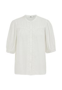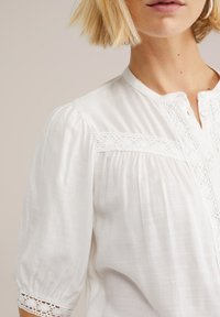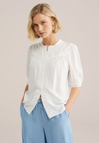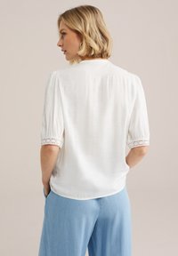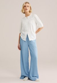 Femme blonde portant un chemisier blanc à manches courtes avec des détails en dentelle et un pantalon à cordon de serrage bleu clair, debout les mains dans les poches.
