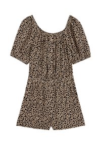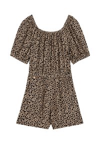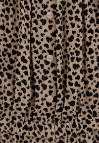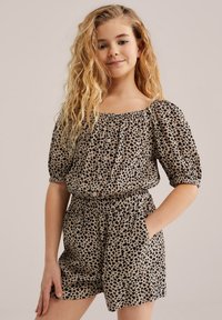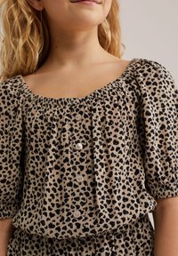 Jeune fille aux longs cheveux ondulés portant un haut à épaules dénudées imprimé léopard et un short, chaussettes blanches et bottes noires cloutées, debout les mains dans les poches.