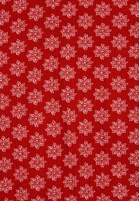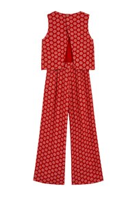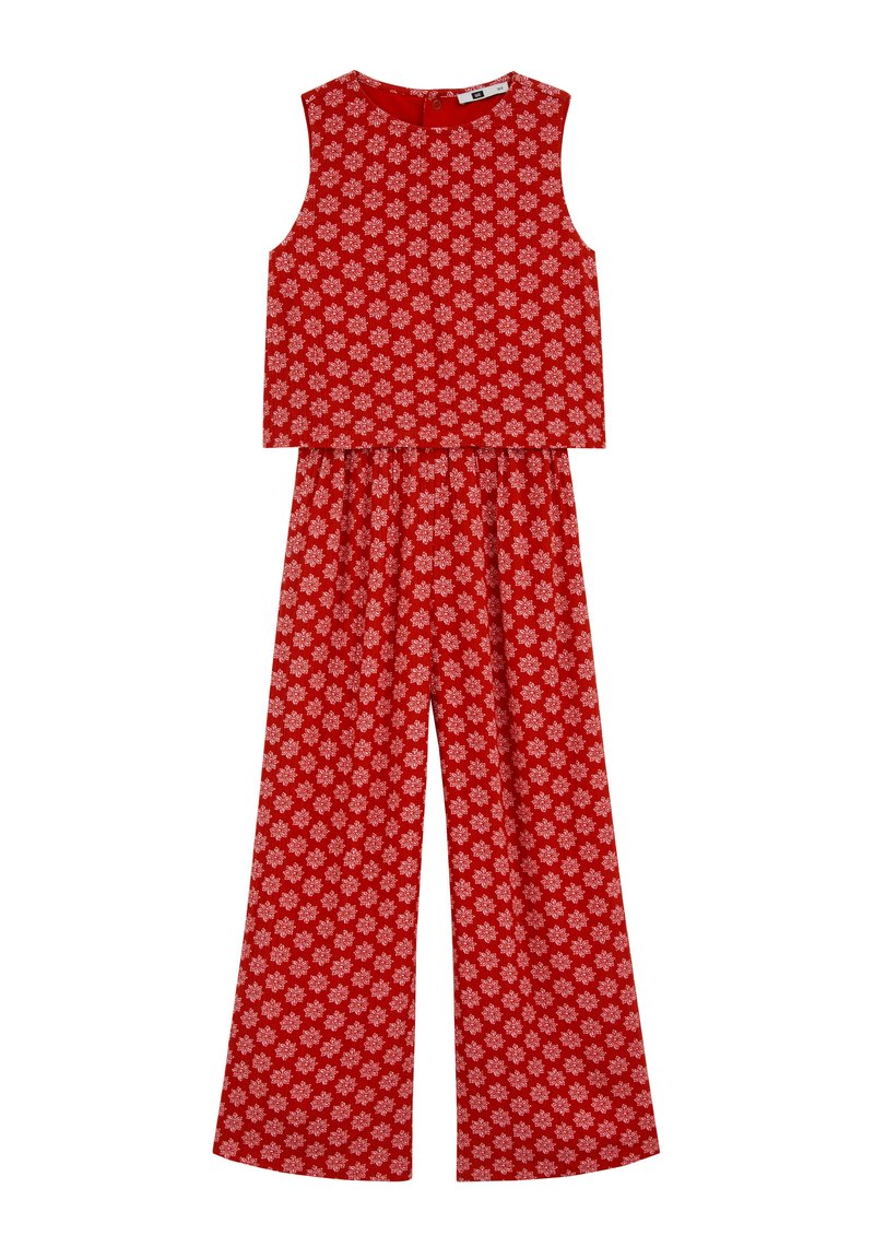 Ensemble composé d'un crop top rouge sans manches et d'un pantalon à jambes larges, avec un motif floral blanc intégral et une taille élastique sur le pantalon.
