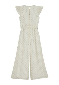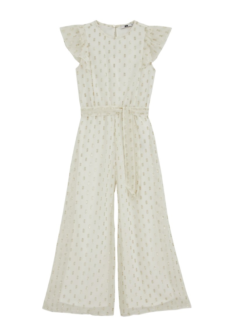 Combinaison pantalon ivoire à jambes larges avec manches volantées, motif subtil en sequins, encolure ronde et ceinture assortie à nouer à la taille.