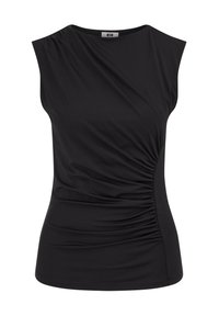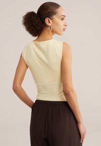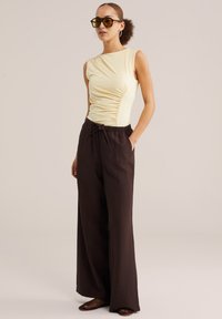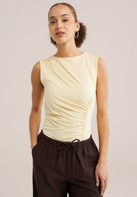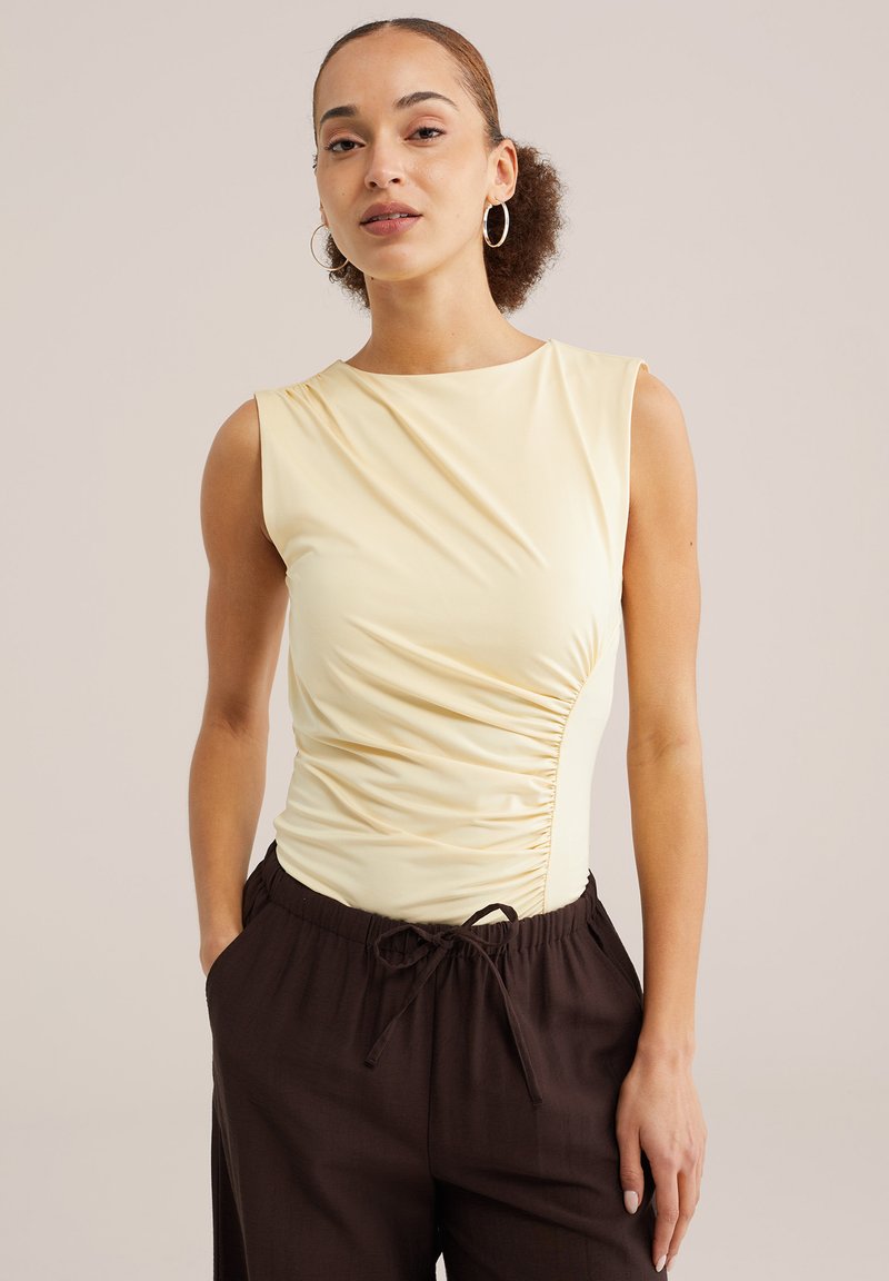Femme aux cheveux bouclés portant des boucles d'oreilles créoles, un haut sans manches jaune clair froncé et un pantalon sombre à cordon de serrage, devant un fond uni.
