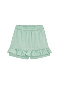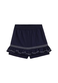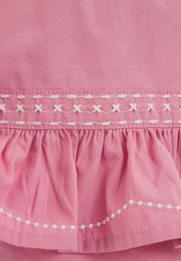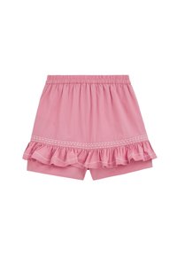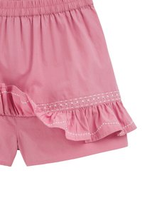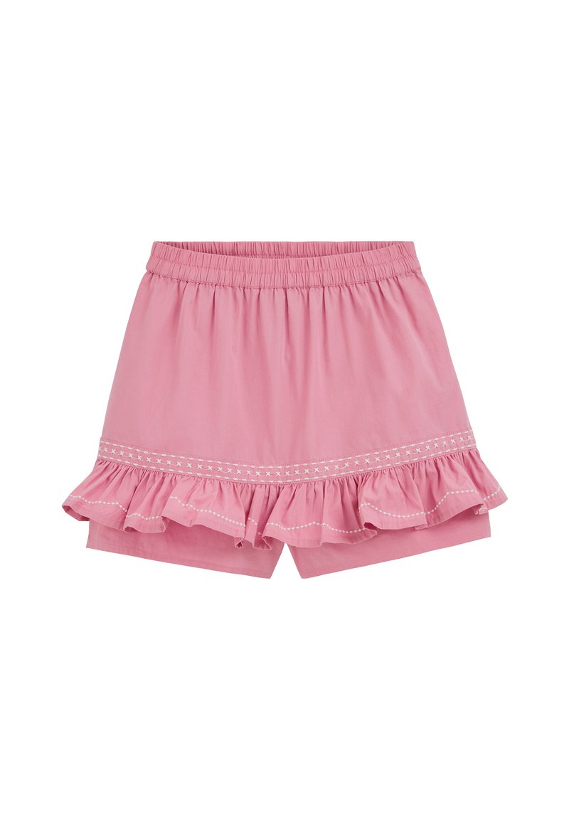 Shorts à taille élastique rose avec ourlet à volants et détail de broderie en point de croix blanche le long du bord inférieur.