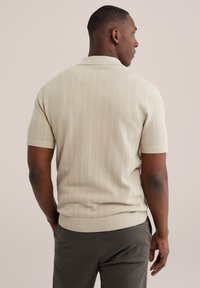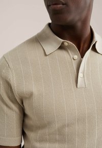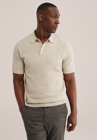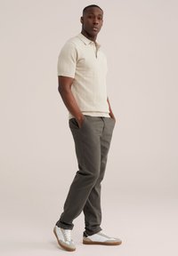 Homme debout, la main droite dans la poche, portant un polo tricoté beige à manches courtes et un pantalon gris foncé, regardant vers la droite.